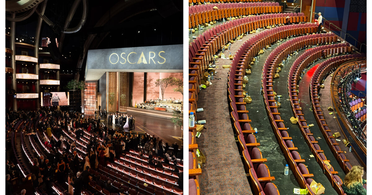 Фотография, споделена в платформата X от американския журналист Мат Неглия, разкрива как изглежда залата на Dolby Theatre след края на церемонията. На кадъра се вижда празната аудитория, а подът и седалките са осеяни с боклуци – бутилки, кутии за пуканки, опаковки от храна и картонени кутии.
