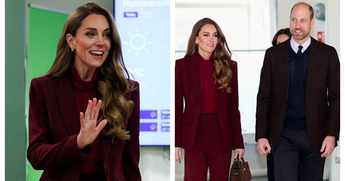Кейт, очаквано, бе облечена в елегантен костюм в цвят бордо, съчетан с блуза в същата гама и подходящи аксесоари.