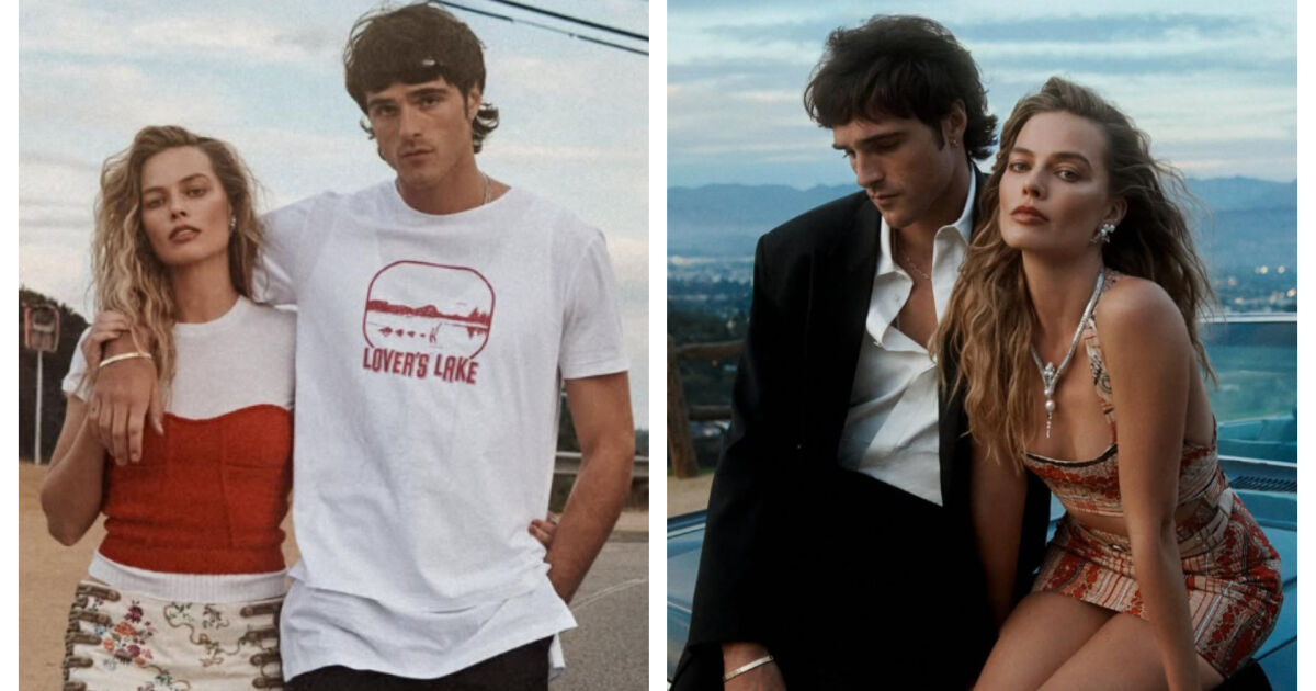 На първата 35-годишната Марго и 28-годишният Джейкъб са вплели тела в страстна прегръдка. Актриста носи в изящен черно-златен сутиен тип бралет и дънков панталон на Versace, допълнени с обеци от австралийската марка Paspaley.