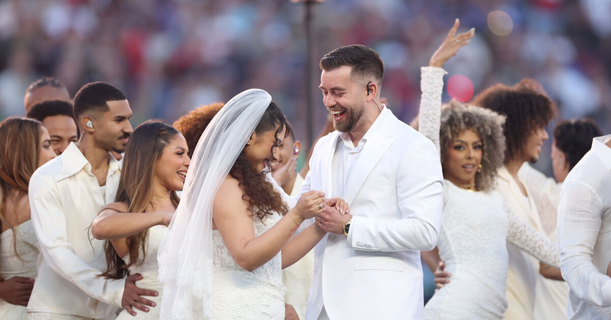 Докато Бед Бъни владее сцената с хитовете си, в единия ъгъл, точно до огромна триетажна торта, стоят двама души. Първоначално много зрители мислят, че са част от шоуто и са просто статисти на мащабната сцена. Оказва се обаче, че пред очите на целия свят двама влюбени официално се заклеват във вечна вярност, потвърждава People. И не, всичко това не е театър, а истинска сватба.