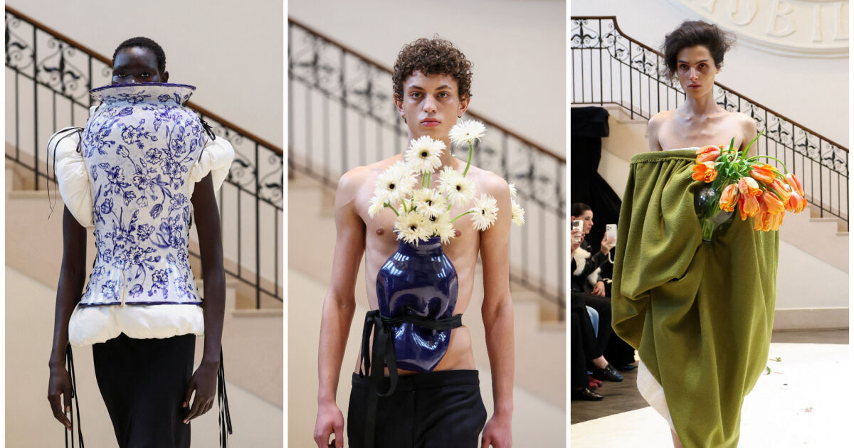 Присъствието на керамика навсякъде напомня за андалусийското наследство на дел Вале: твърд топ с цветя, елек, направен от десетки малки саксии, синя ваза (с гербери, стърчащи отгоре), която сякаш беше смачкана от панделка, с която беше завързана около гърдите на модела.