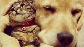 Голдън ретрийвър осинови коте, отхвърлено от майка си