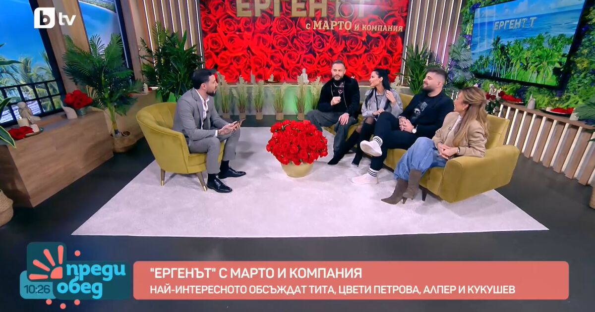 В ефира на „Преди обед“ по bTV рубриката „Ергенът“ с Марто и компания отново събра свежа доза хумор, провокации и откровени мнения за новия сезон на „Ергенът“. Водещият Мартин Николов посрещна в студиото Цвети Петрова, Тита, Алпер Чочев и Кукушев, а разговорът бързо премина към сериозни анализи на ергените и участничките.