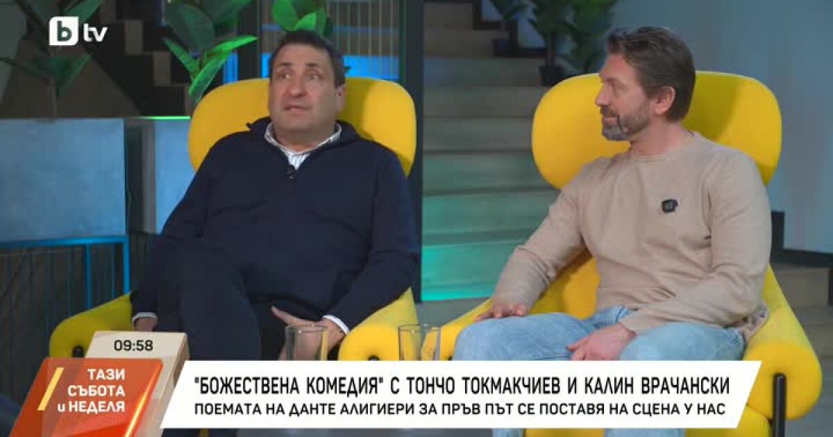 Какво се случва, когато двама от най-харизматичните мъже на българската сцена решат да преминат заедно през деветте кръга на Ада? В предаването „Тази събота и неделя“ актьорите Калин Врачански и Тончо Токмакчиев разкриват тайните на новата мащабна постановка „Божествена комедия“.